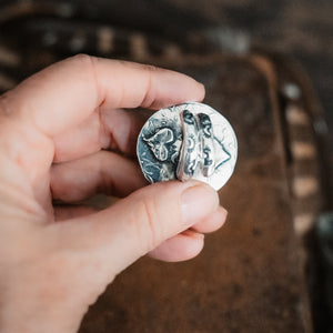 A beautiful sea blue Larimar stone burns bright at the center of this ring with tiny hearts etched all around. Organic hearts adorn the back. Will be adjusted to your size before shipping- please leave a note in the "special requests" box upon checkout with your ring size or we will be happy to contact you!