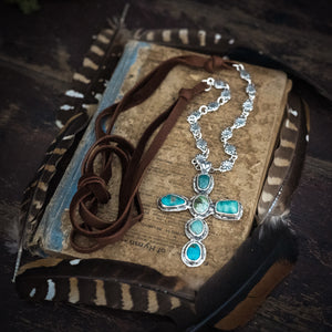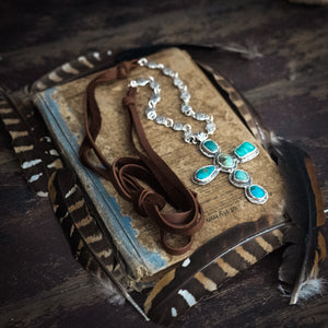 Keep your faith with this unique cross set with big nuggets of Kingman, and Royston Turquoise. Hung from our hand hewn Sunburst Links and Chocolate Brown deerskin leather. This is a big, western version of a rosary necklace It is adjustable and ties in the back
