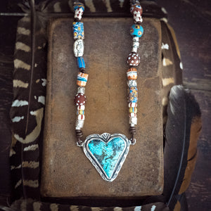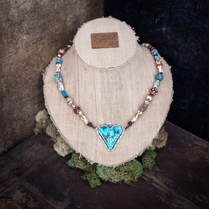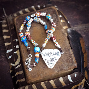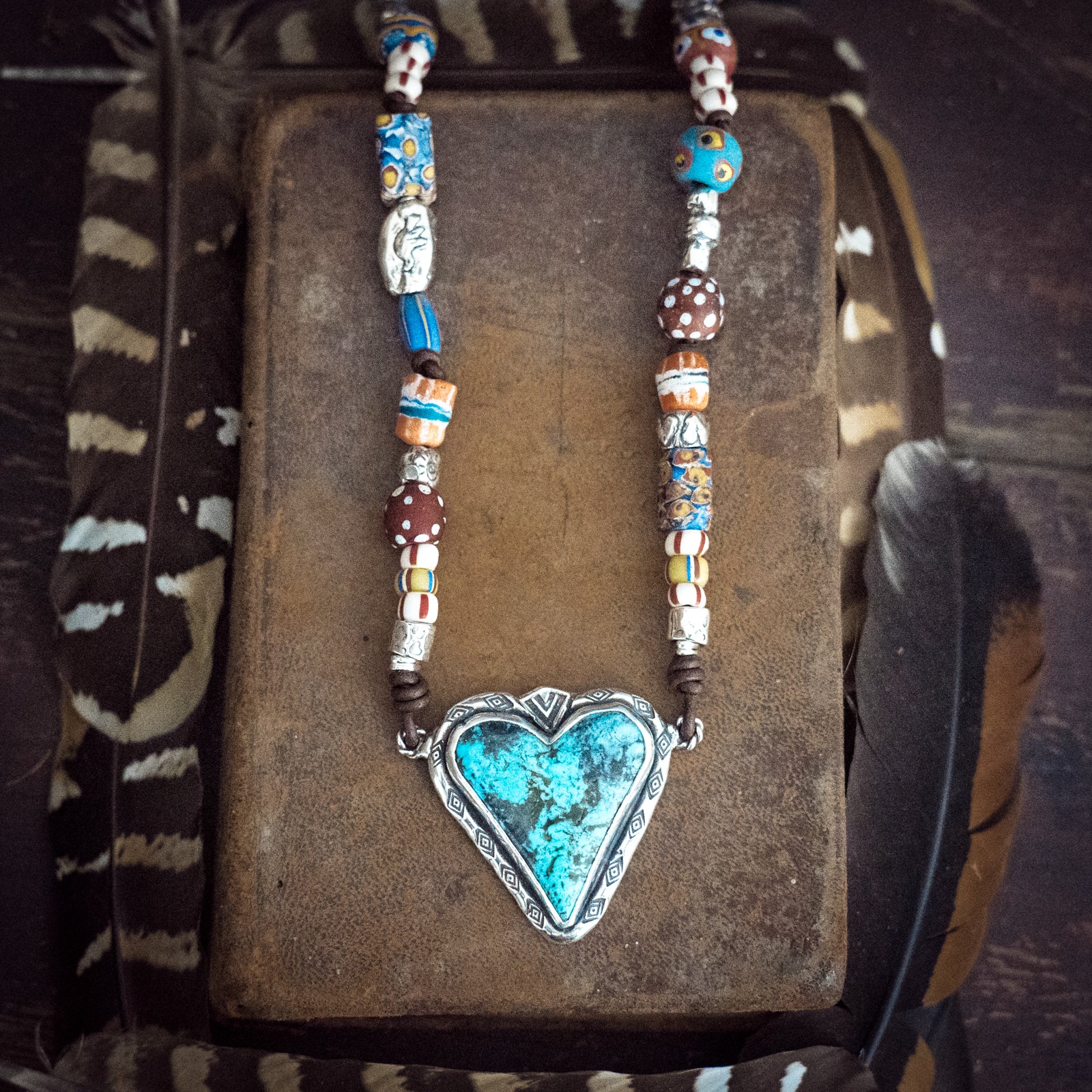 Stay bold and brave with this Cloud Mountain Turquoise Heart. This necklace is strung with 200 year old African trade beads and hand carved sterling silver beads. Etched onto the back are the words “warrior heart”. Strung on Chocolate brown leather