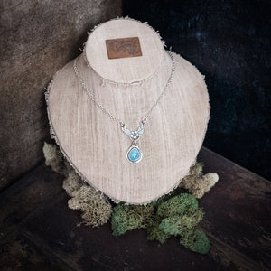 A beautiful bright nugget of Aquamarine dangles from a flower charm keeper. One the back are written the words "always bloom". Sterling silver and One of a kind