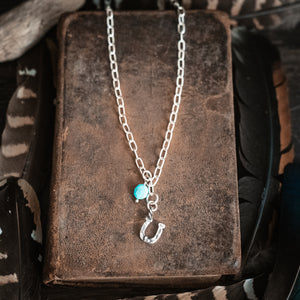 Sterling silver links lead to an organic horseshoe with a turquoise nugget swaying nearby. 18-19" long adjustable.