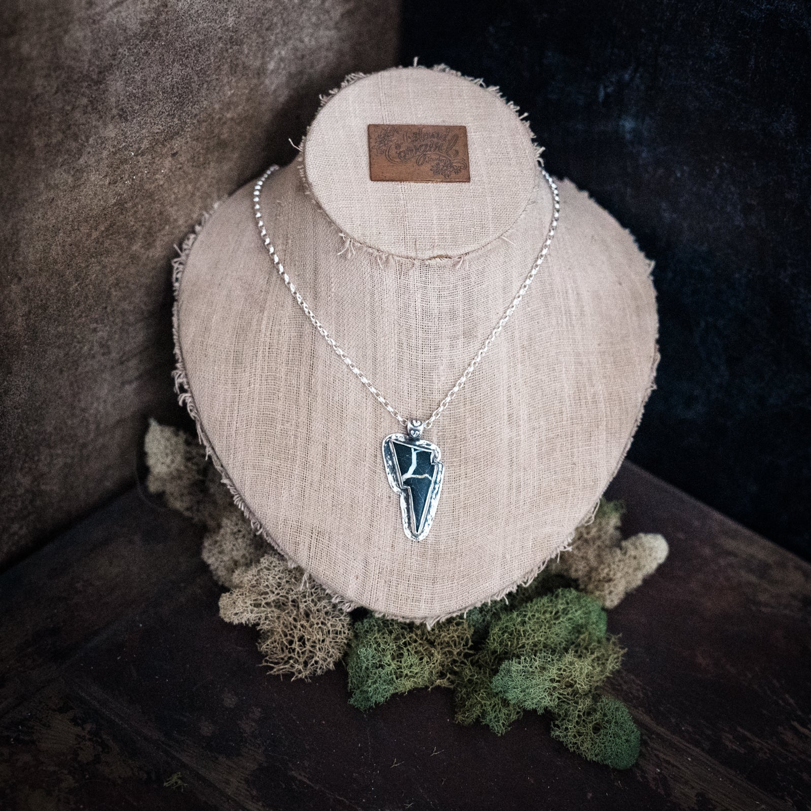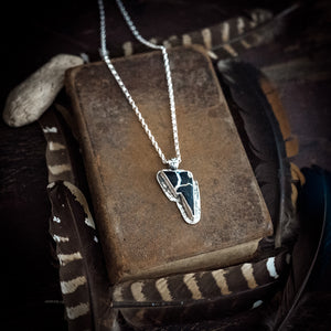A beautiful lightning bolt of White Buffalo is set into sterling silver.   The words "shine bright" are etched onto the back.