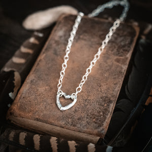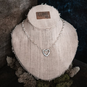 A rustic open heart bearing x's and o's hangs from a sterling silver chain.  Measures 18-19" long-adjustable