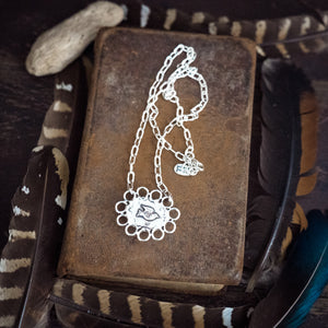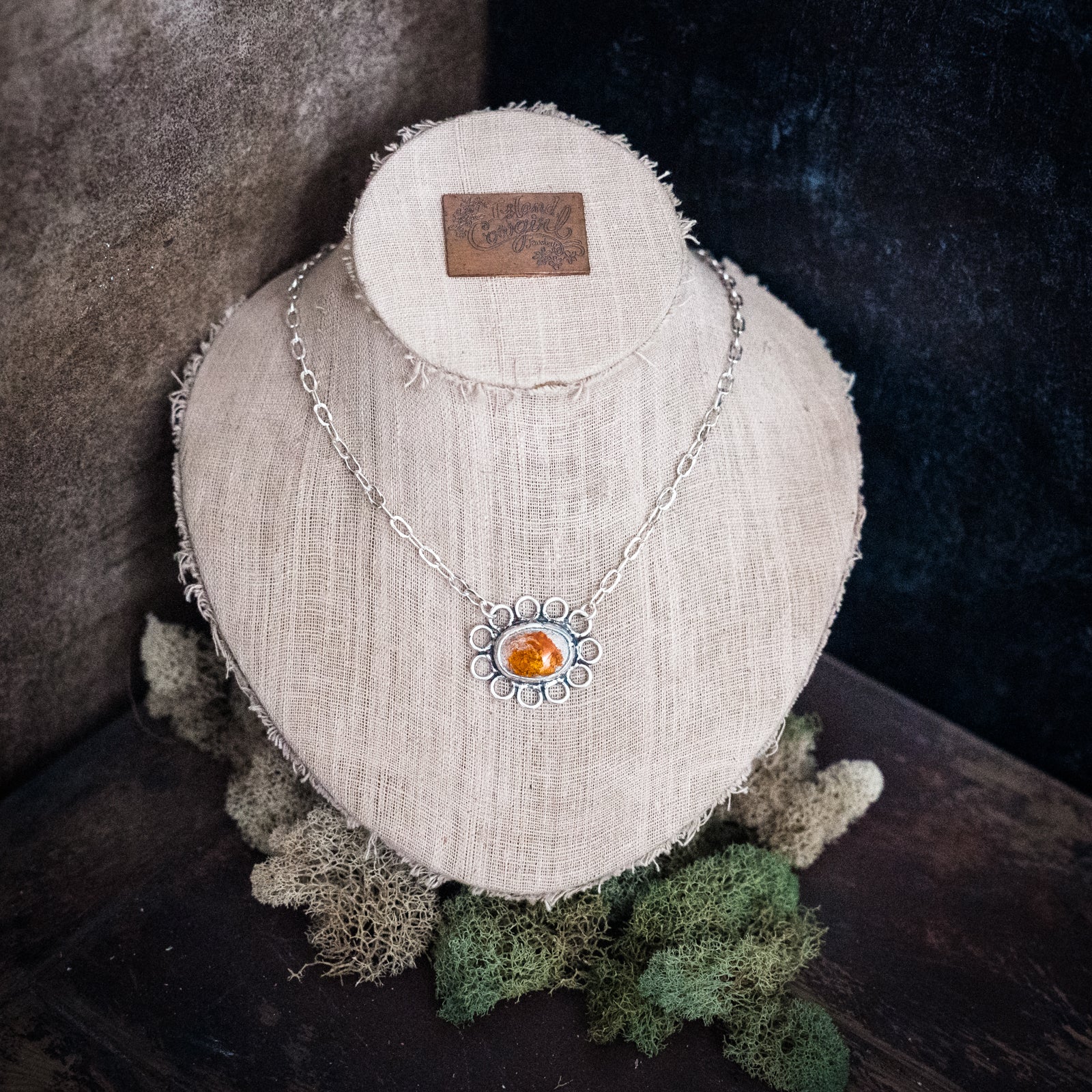 A rare Fire Opal is set into a beautiful hand carved flower.  On the back is a beautiful peace dove.. Sterling silver and One of a kind