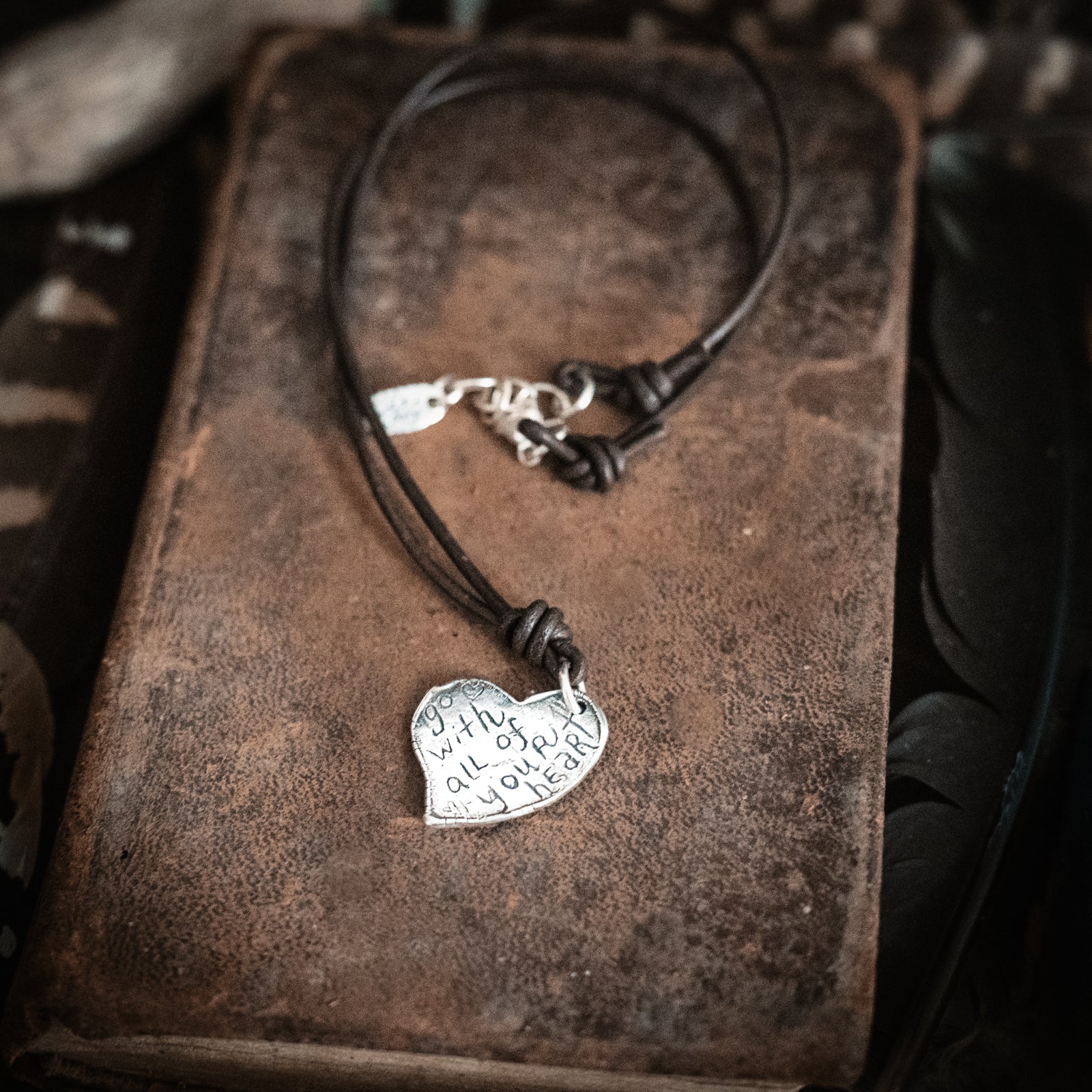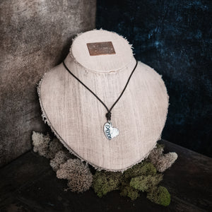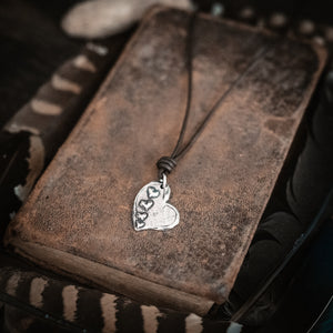 A large organic heart is anchored on soft chocolate leather cord. The words "go with all of your heart" are etched onto the back. Measures 18-19" long-adjustable