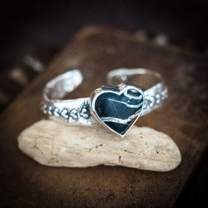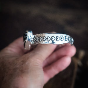 This hefty hand hewn sterling cuff is set with a rare White Buffalo Turquoise heart. Tiny organic hearts are carved along the sides. One of a kind