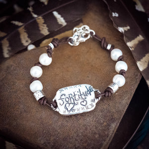 A beautiful Number 8 Turquoise stone sits atop a hefty sterling bezel. The words "fortitude" are etched onto the back. Freshwater pearls are laced onto the chocolate leather cord and hand hewn sterling silver beads. Clasp closure