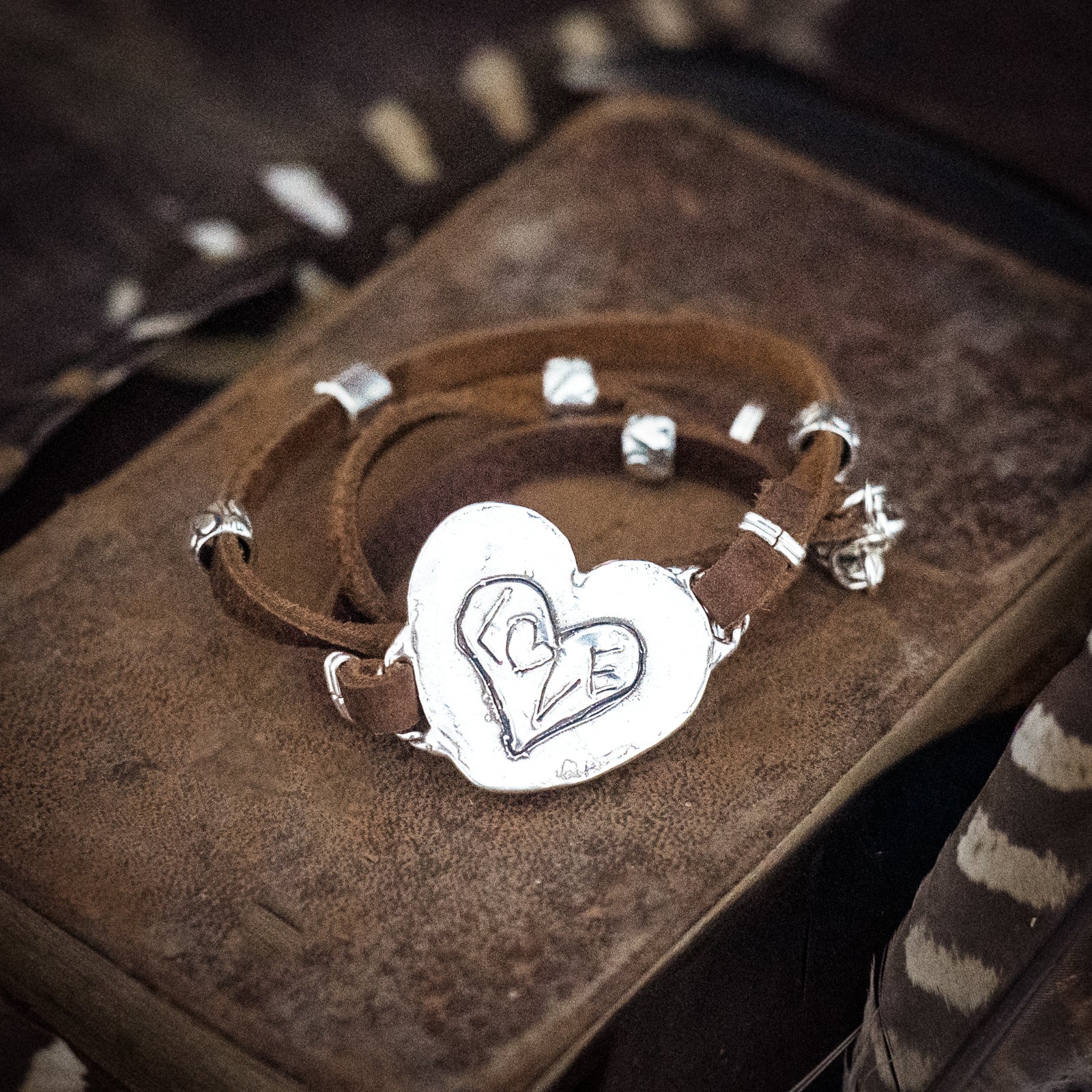 A gorgeous Kingman Turquoise heart is set into a sterling bezel. A big organic heart is etched onto the back.  Strung on buttery soft chocolate strap with hand hewn sterling beads.