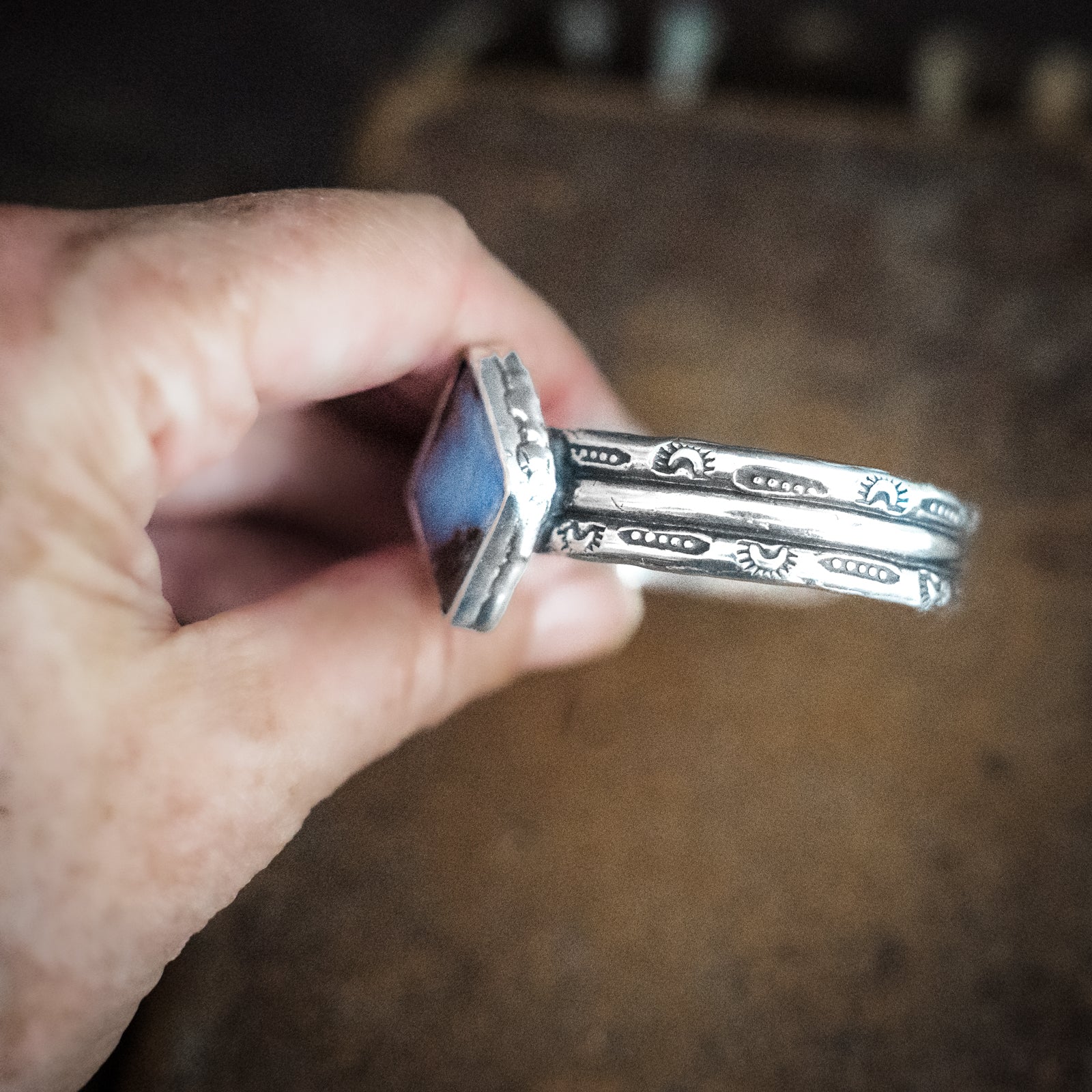 A hefty sterling cuff bearing warrior markings around the edges. A big, beautiful nugget of Australian Opal is in the center.