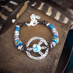 A beautiful Golden Lavender Turquoise nugget is set into a hand hewn peace sign.. Laced onto the chocolate leather cord are 200 year old African Trade Beads and hand hewn sterling silver beads. Toggle closure