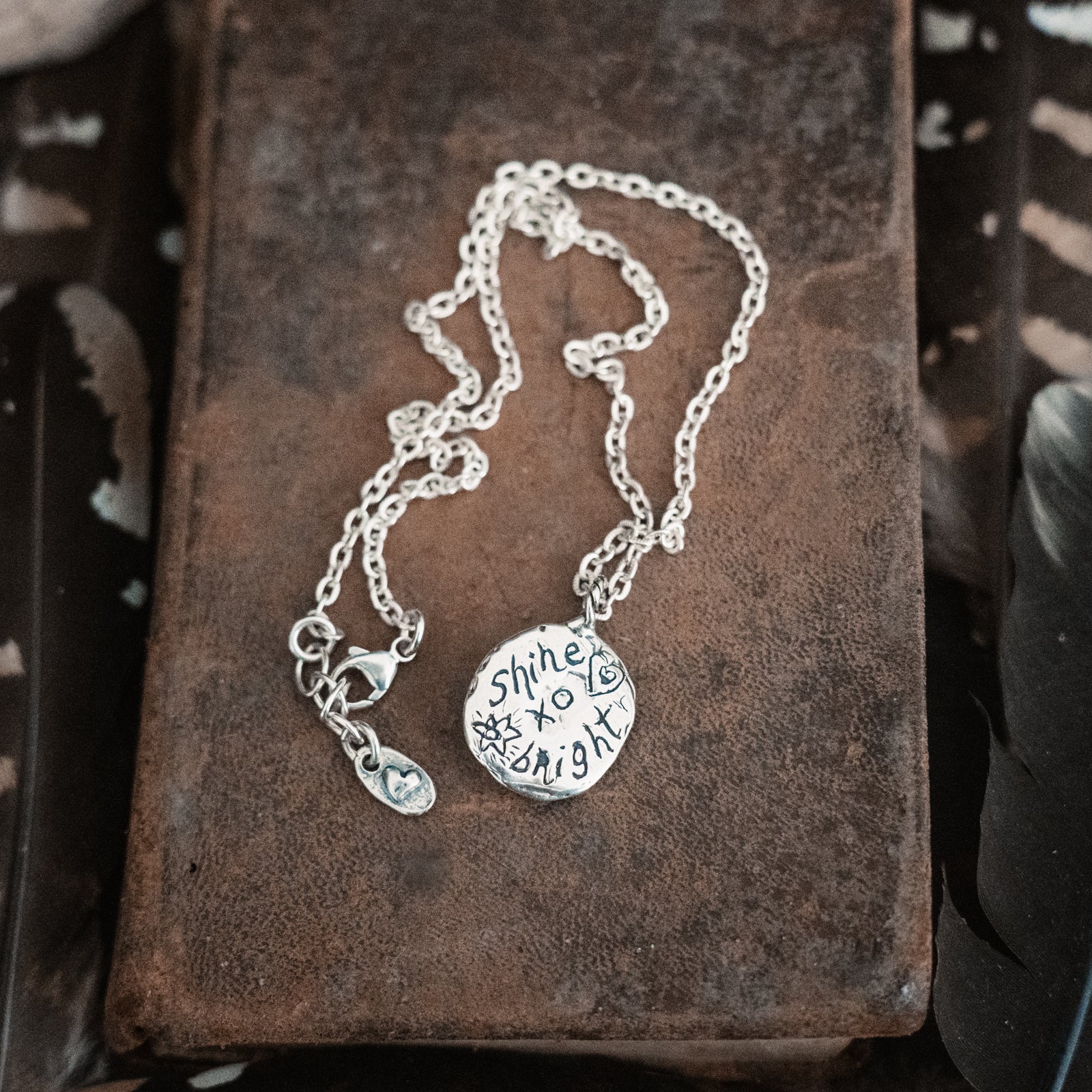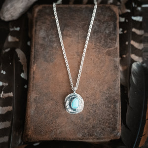 A lovely nugget of Royston turquoise sits next to a sterling moon and stars. Written on the back are the words "shine bright". Sterling silver - One of a kind